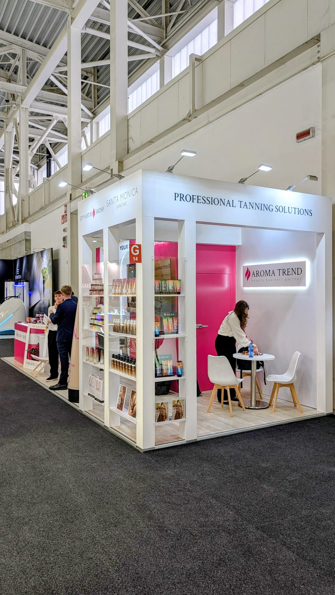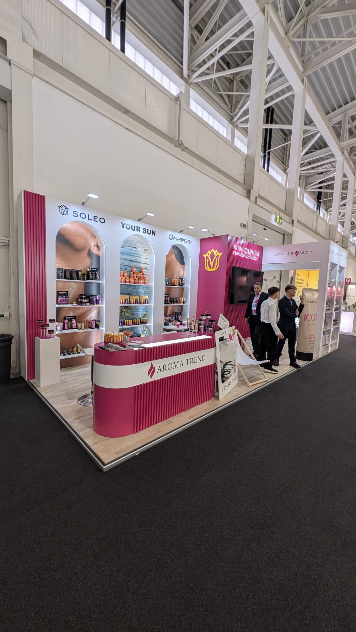 Stoisko AromaTrend zostało zaprojektowane jako przestrzeń otwarta z trzech stron, co znacząco zwiększało jego dostępność i naturalnie kierowało ruch odwiedzających do wnętrza ekspozycji. Układ został podzielony na trzy funkcjonalne strefy – po prawej stronie znalazła się wizualnie wydzielona przestrzeń do rozmów, zapewniająca komfort spotkań biznesowych, w centralnej części zaplecze z telewizorem na ścianie wspierającym prezentację oferty, natomiast po lewej stronie strefa ekspozycyjna z próbkami oraz ladą, pełniącą funkcję punktu kontaktowego. Całość została utrzymana w wyrazistej kolorystyce mocnego różu i bieli, co nadało stoisku nowoczesny, dynamiczny charakter i pozwoliło wyróżnić się w przestrzeni targowej.